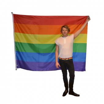 Beskrivning: Prideflaggan / gay flaggan är tryckt med genomfärgat tryck och är sydd runtom med dubbla rader stygn. Förstärkning på ena kortsidan med polyesterband 30mm och 2st D-öglor för upphängning i flaggstång.